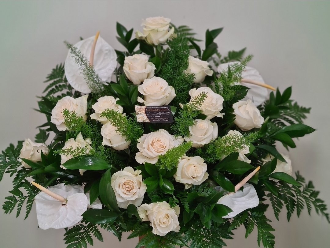 Elegante e Raffinata Composizione Funebre N.B. Immagine indicativa, il vostro Omaggio sarà realizzato in base al materiale disponibile, sarà nostra cura contattarvi per creare l'omaggio che desiderate. N.B. Nelle note indica: Giorno di Consegna, Nome Cognome del Defunto, indirizzo e Recapito Telefonico di un Parente !!!